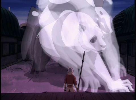 На огромной скорости дракон нёсся прямо на тело настоящего Аанга, сидящего наверху статуи медведя. Аанг-призрак поднял руки, ожидая столкновения, но всё произошло незаметно. Сидящий в позе лотоса Аанг открыл глаза, ещё раз внимательно взглянул на статую и, раскрыв планер, полетел в деревню.